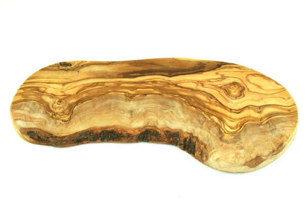 Charaktervolles Schneidbrett aus Olivenholz mit rustikalem Rand.  Je nach Beschaffenheit des Ausgangsmaterials wird die Rinde teilweise erhalten.